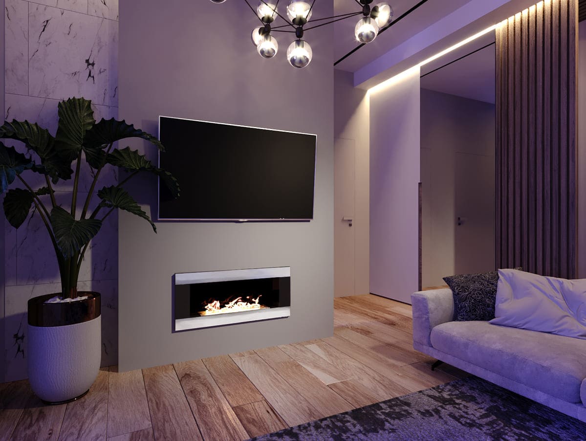 Декоративное стекло — крепится на всю заднюю стенку очага. За счет своего зеркального отражения, пламя визуально становится в 2 раза больше и кажется, что камин горит еще ярче.