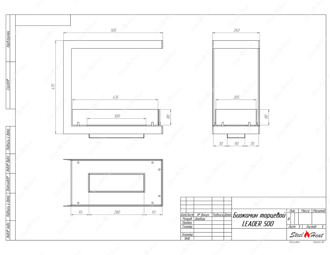 Встраиваемый Биокамин торцевой SteelHeat Leader 500предназначен для встраивания в глухие ниши из гипсокартона, кирпича, пеноблоков, бетона.