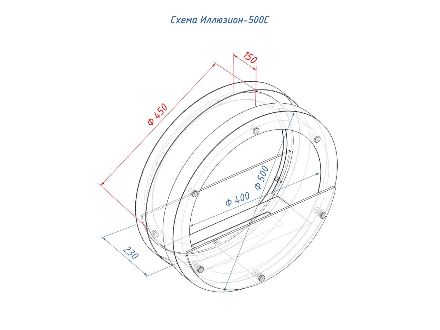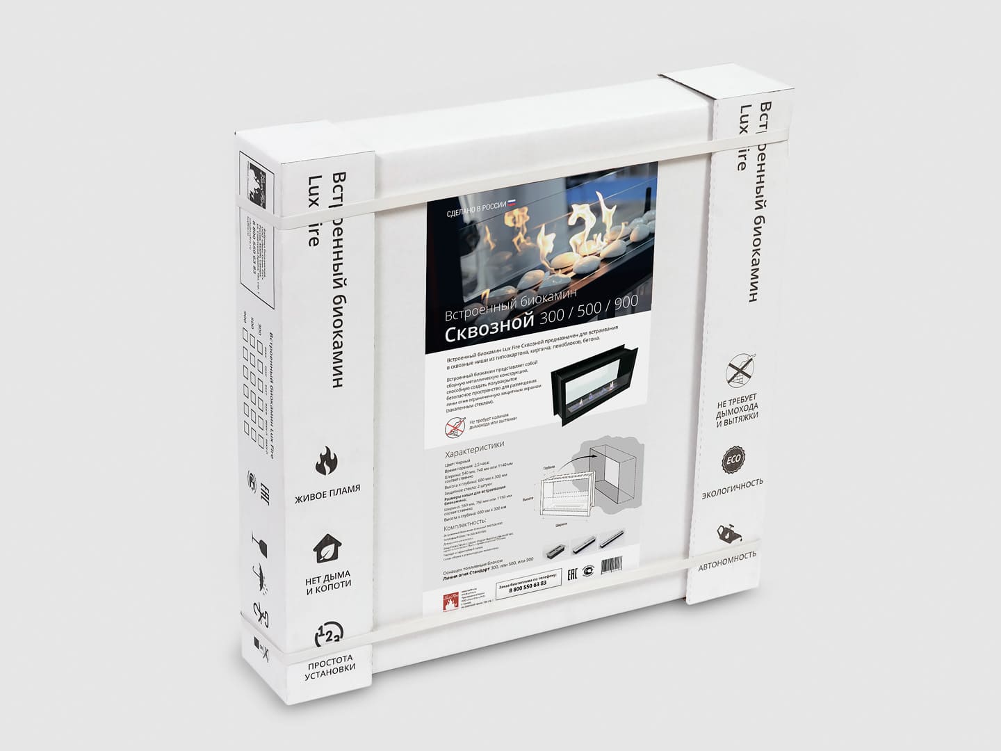 Представляет собой настенную сборную металлическую конструкцию круглой формы класса XS в виде кольца , создающую полузакрытое безопасное пространство для огня с топливным блоком Lux Fire 250 XS ограниченную закаленным стеклом в котором горит живой огонь с углом обзора 180 градусов. Универсально подходит для встройки в нишу или подвеса на стену.