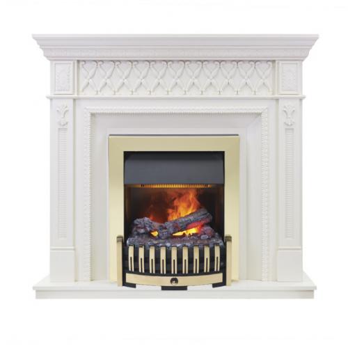 Каминокомплект «Alexandria» от производителя Dimplex, оборудованный очагом «Opti-Myst Danville Brass», выполнен в классическом стиле и подходит для оформления помещений различной площади. Цвет портала и очага гармонично сочетаются, что позволяет создать в комнате приятный контраст. При своих габаритах изделие визуально выглядит не слишком массивно, что обусловлено светлой расцветкой портала.