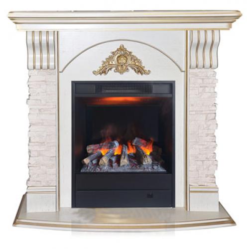 Выполнен портал каминокомплекта из сочетания МДФ и искусственного камня. Это придает изделию основательный вид, что позволяет не сомневаться в его надежности. Основа портала выполнена из МДФ, плотность которого обеспечивает высокую жесткость конструкции и ее устойчивость. Из камня белого цвета выполнены боковины портала. МДФ для дополнительной защиты и декорирования покрывается натуральным шпоном. Он имитирует по цвету и фактуре Белый дуб, отличающийся благородным видом. Для придания более роскошного вида порталу в его декорировании используется золотая патина. Ею покрываются резные и декоративные элементы портала. Очаг каминокомплекта выполнен из качественной стали. Покрытие его осуществляется при помощи порошковой краски черного цвета. Она обеспечивает защиту изделия от внешних негативных факторов и коррозии, обеспечивая более долгий срок службы.