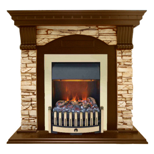 Каминокомплект «Dublin» от производителя Dimplex, оборудованный паровым очагом «Danville Brass», имеет небольшие габариты, что позволяет ему вписаться в интерьер даже небольших по площади помещений. Выполнена его отделка с использованием камня и дерева, что актуально для классических стилей и стиля кантри в частности.