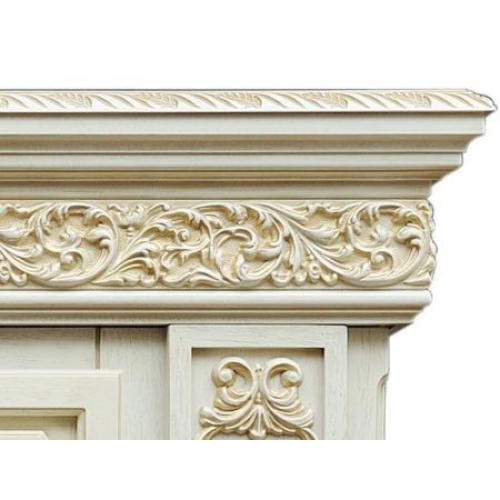 Каминный угловой портал «Ekaterina» выполнен в цвете «белый шоколад». Пилястры и карниз украшены красивым растительным узором цвета позолоты, кромка верхней панели с резным узором. Основание портала массивное, придает камину солидности. Камин в обрамлении такого портала отлично впишется в интерьер залы или спальни в классическом стиле.