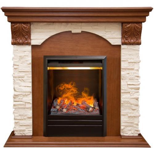 Каминокомплект «Dublin Lux» представлен производителем Real Flame и укомплектован современным паровым очагом «3D Olympic». В его оформлении использован искусственный белый сланцевый камень и имитация древесины Ореха. Из основных преимуществ комплекта при оформлении помещения является его компактный размер. Даже с учетом каменной облицовки и темного декора выглядит он совершенно не массивно, благодаря чему и в небольших помещениях такой камин не будет загромождать пространство.
